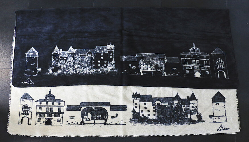 Auf dem Bild die Motive Marktplatz Vintage, Sunset Skyline, Skyline blau mit gelb-blauen Karos,