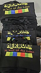 Unsere coolen T-Shirts von XS bis XXL zu jeweils 30 € in weiß oder schwarz, der Buchstabe "E" in rot oder blau oder grün....