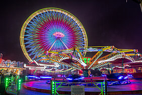 Für Nervenkitzel sorgen Fahrgeschäfte wie der „Blue Fire“, ein dreidimensionales Bewegungswunder der Polyp-Klasse, die schwungvolle Berg- und Talbahn, der spektakuläre „Top Spin“ sowie der luftige „Flying Swing“. Natürlich darf auch der Evergreen Autoscooter nicht fehlen – ebenso wie der X-Faktor, der Action und Spaß garantiert.