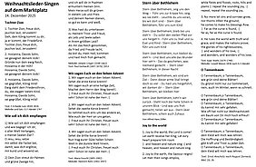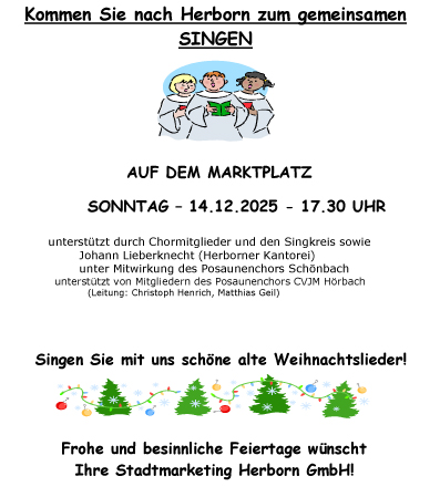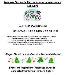Für alle zur gemeinsamen Einstimmung auf Weihnachten findet jedes Jahr kurz vor den Feiertagen auf dem Marktplatz ein gemeinsames Singen statt. Weihnachtsstimmung kann man nicht kaufen – aber man kann sie ganz leicht und auch noch gratis bekommen. Nur singen müsst ihr dafür! Das festliche Gefühl stellt sich dabei ganz von alleine ein, Kindheitserinnerungen werden wach – spätestens, wenn die Glocken der beiden Kirchen zu den Klängen des letzten Liedes ertönen - in der großen Gemeinschaft der Singenden.