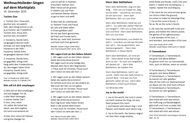 Unterstützt von den Posaunenchören der Stadtteile Schönbach und Hörbach ist dies ein beglückendes Erlebnis – so finden sich jedes Jahr immer mehr begeisterte Mitsingende! Alle, groß und klein, alt und jung, können ganz ungezwungen mitsingen. 2025 wird am Sonntag, 14. Dezember um 17.30 Uhr gesungen. Sei dabei!